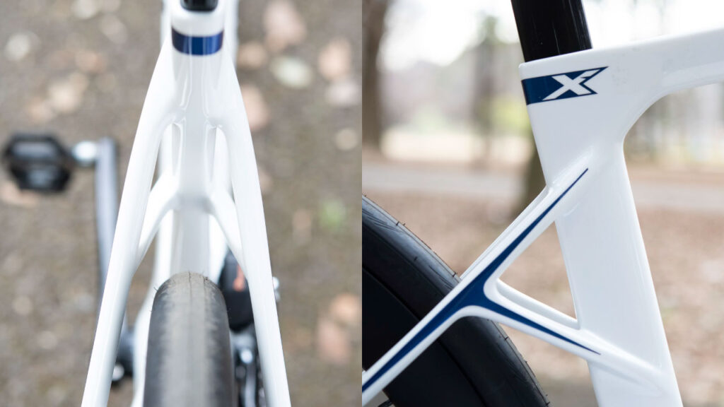 シルエットはドグマXに似るが、フレームの設計はXシリーズ専用。ドグマXではX-STAYS部にシートステーブリッジが設けられるが、Xシリーズでは搭載せずシンプルな形状となっており、よりしなやかな乗り心地を実現しているという。フレーム各所にピナレロのアイデンティティでもある左右非対称設計を取り入れていることも特徴だ。
