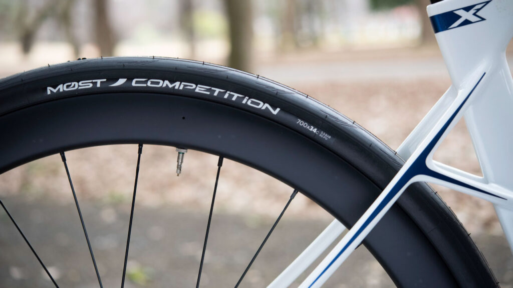 F5に比べると、X5はさらに安定感が高まっており、安心してバイクに身を預けることができる。しかし、あくまで「速く走る」ことを前提にしたバランスだ。エンデュランスロードにしてはしっかりとした剛性が持たされており、加速も登坂も力強い。直進安定性は高いが、頑として曲がりたがらないタイプではなく、操作にしっかりと応えてくれるハンドリングを持っている。純正パーツがカーボンホイール(バランスのとれたモスト・ウルトラファスト)と軽量タイヤ(モスト・コンペティション35C)であることも軽やかな走りに貢献している。
