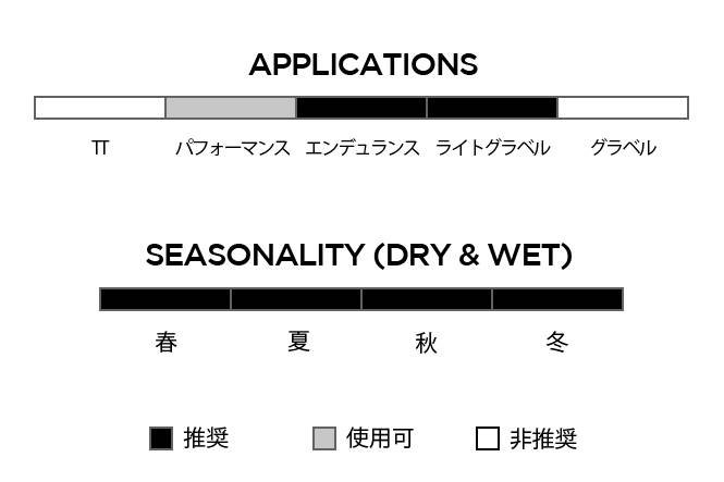 ナイロン・ケーシングの上に、内側から外側に向けて、様々な構成要素を重ねる特許出願中の技術です。両サイド全面に貼られた高密度なナイロン層により、タイヤのカットを防ぎ、低内圧でも安定した走行が可能となります。トレッドのすぐ下に貼られた、高密度で波上になったアラミド繊維のブレーカー・ベルトがパンクやカットを防ぎます。