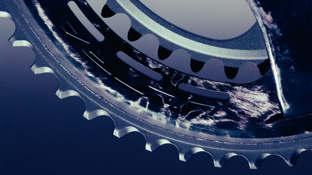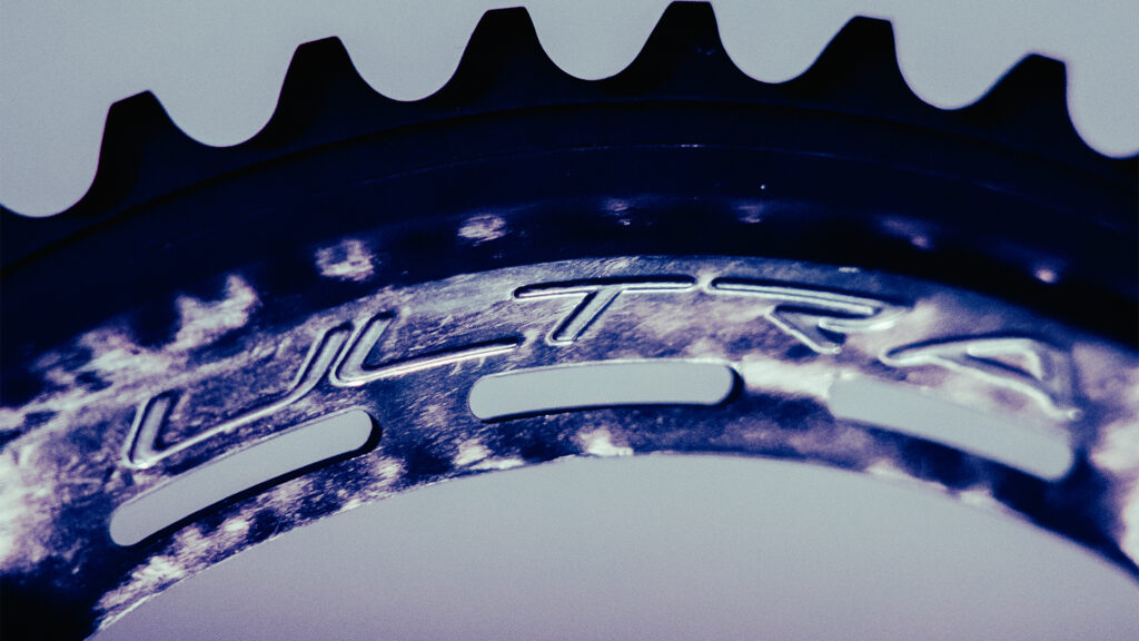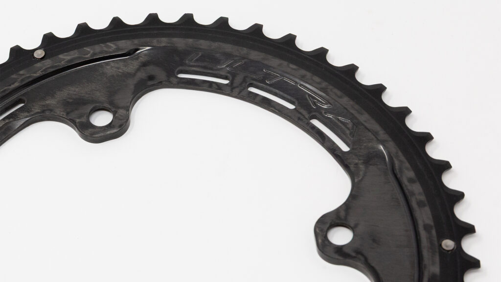 「ULTRA」ロゴやチェーンリングのディテールは金型から直接成型されており、先進の素材を自在に扱うカンパニョーロの高度な技術力を証明しています。このチェーンリングは、ヴィチェンツァの本社で完全に設計・製造されています。