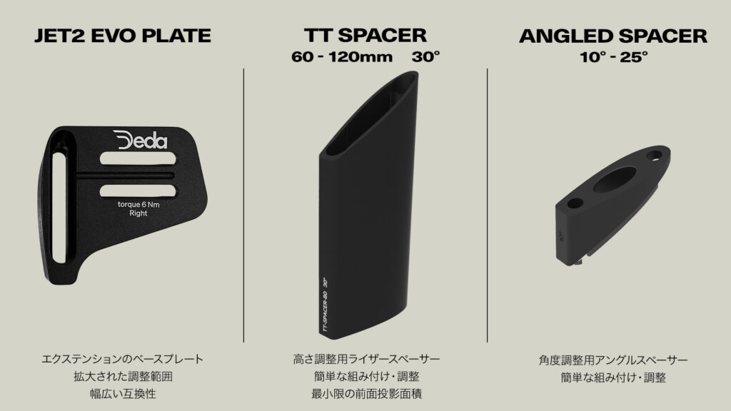 2026新製品よりDEDA ELEMENTIのエアロバーは新しいスペーサーシステムを採用します。最新のエアロバーセッティングのトレンドに最適化されたニューモデルは、シンプルなパーツ構成で組み付けや調整が簡単に行え、様々なエアロコックピットに対応するモジュラーシステムを採用します。