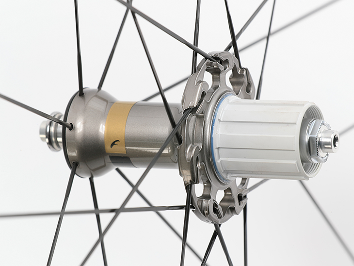 カーボンボディにゴールドラインが入り、美しいコントラストを見せるフロントハブ。
